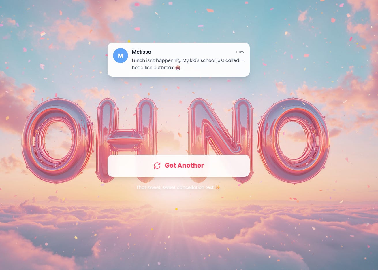 Oh No, It Canceled! generates fake cancellation messages. For you. Whenever you need one. Which, if you’re anything like me, is approximately always.
